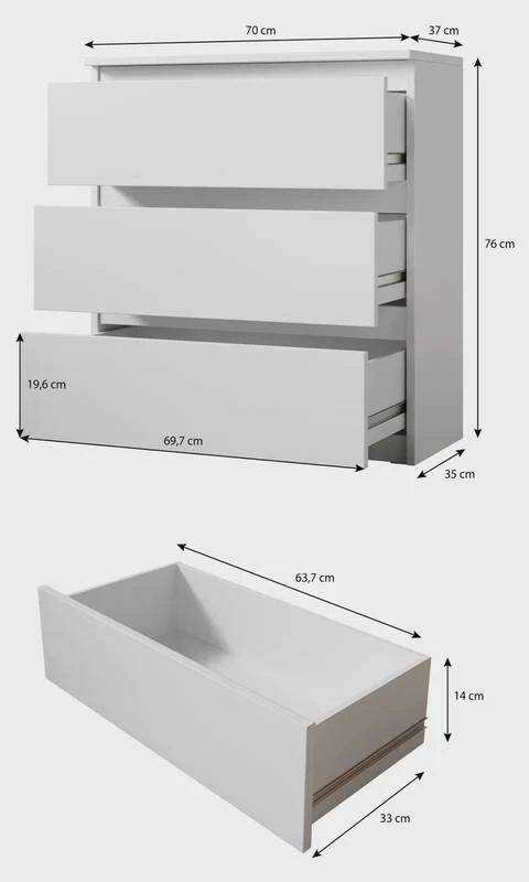 -Kompakt : Mit den Maßen B70 x H76 x T35 cm erweckt die kompakte Schubladenkommode einen soliden Eindruck und fügt sich hervorragend in bestehende Einrichtungskonzepte ein. Das Montagezubehör und die Anleitung liegen beiDie schlichte Kommode mit 3 Schubladen ist 70 cm breit, 76 cm hoch und 35 cm tief. Das praktische Möbelstück überzeugt mit pflegeleichten Materialien, kratzfesten, wasserabweisenden Oberflächen und sorgfältiger Verarbeitung. Sie ist ideal für Wohnzimmer, Jugendzimmer oder Diele.
